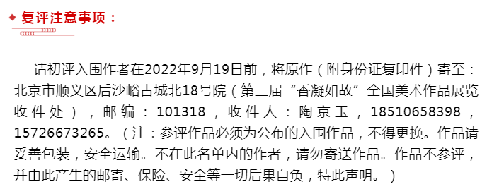9月6日,由民革中央、中國美術家協會、中國美術館共同主辦的“第三屆‘香凝如故’全國美術作品展覽”(暫定名)初評工作會在京舉行。中國美術家協會組織專家完成了此次初評工作。當日,中國美術家協會官網公布第三屆“香凝如故”全國美術作品展覽初評結果及復評注意事項。