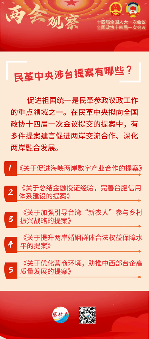 圍繞助推中西部臺企高質量發展建言、為促進兩岸數字產業合作支招、建議完善臺胞信用體系建設……在民革中央擬向全國政協十四屆一次會議提交的提案中,有多件提案建言促進兩岸交流合作、深化兩岸融合發展。