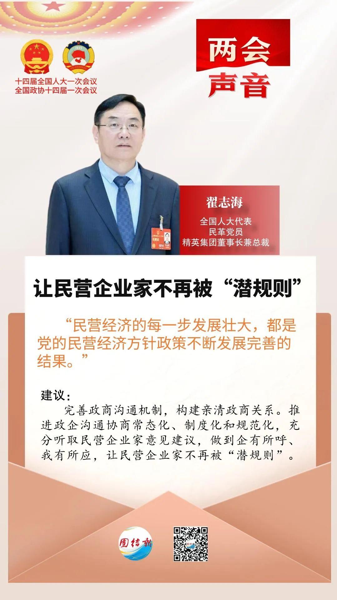 “民營經濟的每一步發展壯大,都是黨的民營經濟方針政策不斷發展完善的結果”“民營企業發展面臨壓力的背景下,信心和信念顯得尤為重要”“單獨設立民營企業營商環境評價指標體系,以更好保護民營經濟市場主體地位和積極性”“應大力扶持民營文化企業高質量發展,激勵創作出高品位、有內涵、重審美的文化精品,為中華文化國際傳播提供產品支撐”......作為全國人大代表,民革黨員翟志海關注的領域很廣,但如何為民營企業發展創造更好條件始終是他放不下的牽掛。在今年全國兩會上,翟志海在深入調研的基礎上帶來了7份建議,其中一半和民營企業發展有關。