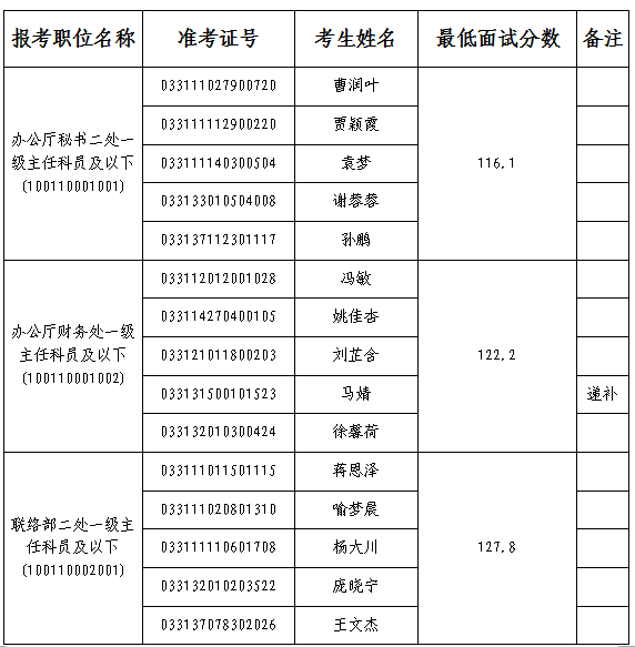 因部分考生自愿放棄面試資格,根據(jù)關(guān)于公務(wù)員招考面試工作的有關(guān)規(guī)定,按照公共科目筆試成績(jī)從高到低的順序遞補(bǔ)考生進(jìn)入面試名單,并相應(yīng)調(diào)整職位面試最低分?jǐn)?shù)線。面試人員名單如下(以準(zhǔn)考證號(hào)排序):