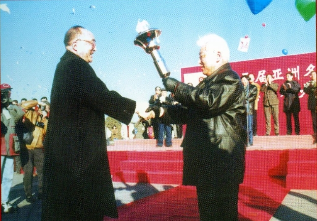 1996年亞冬會在黑龍江省舉行,時任黑龍江省副省長、民革黑龍江省委會主委周鐵農(nóng)從國家體委主任伍紹祖手中接過亞冬運會火炬。