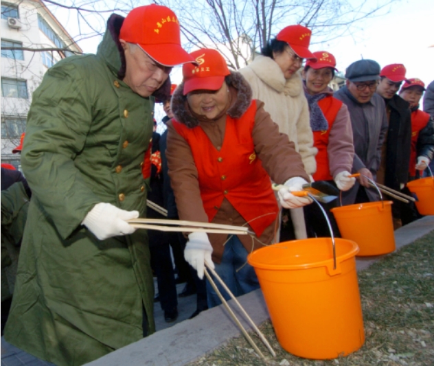 2005年12月5日,世界第二十個國際志愿者日當(dāng)天,周鐵農(nóng)在北京石景山區(qū)魯谷社區(qū)參加社區(qū)志愿服務(wù)活動,和其他幾位義工一起清除草坪中和人行過道上的雜物。新華社記者 王建華攝