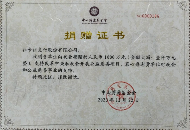 2021年11月,中山博愛基金會與拉卡拉支付股份有限公司簽署《戰略合作協議書》,拉卡拉計劃向中山博愛基金會捐款1億元,支持民革中央和中山博愛基金會開展公益慈善活動,為實現“共同富裕”貢獻力量。根據《戰略合作協議書》約定,捐贈款分十年支付,2021年至2030年每年支付1000萬元人民幣。本次捐款系第3年度捐贈,拉卡拉支付股份有限公司已向中山博愛基金會捐款累計3000萬元。
