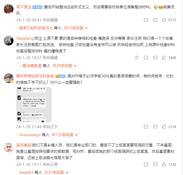 許多中小學教師每天最大的工作不是教書育人,而是要完成各種“保險、防詐、安全頭盔、防溺水、美育、競賽、活動、突擊檢查、APP下載、打卡、拍照、美篇、公開課等”。有些教師每周參加會議及學習十次以上,每學期數十本臺賬,根本沒有時間提升教學質量,關心中小學生的心理成長變化。