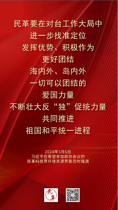 習近平強調,民革要在對臺工作大局中進一步找準定位、發揮優勢、積極作為,更好團結海內外、島內外一切可以團結的愛國力量,不斷壯大反“獨”促統力量,共同推進祖國和平統一進程。要積極推動兩岸科技、農業、人文、青年發展等領域交流合作,深化兩岸各領域融合發展。