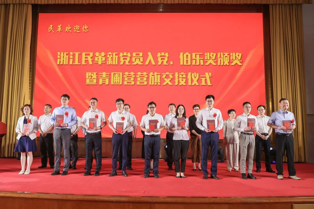 民革中央專職副主席谷振春,民革中央辦公廳一級巡視員、團結報社社長邵丹峰,民革浙江省委會主委吳晶,民革浙江省委會副主委劉凈非、林革、金珊、章獻民、徐銘恩、朱法君同志上臺為新黨員頒發入黨通知書和《中國國民黨革命委員會章程》。