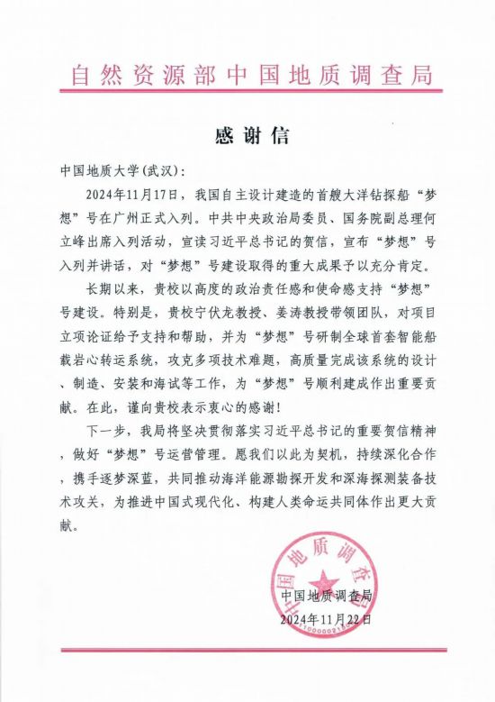 “夢想”號海試成功并正式入列,自然資源部中國地質調查局向中國地質大學(武漢)發來感謝信,對學校以高度的政治責任感和使命感支持“夢想”號建設表示感謝。