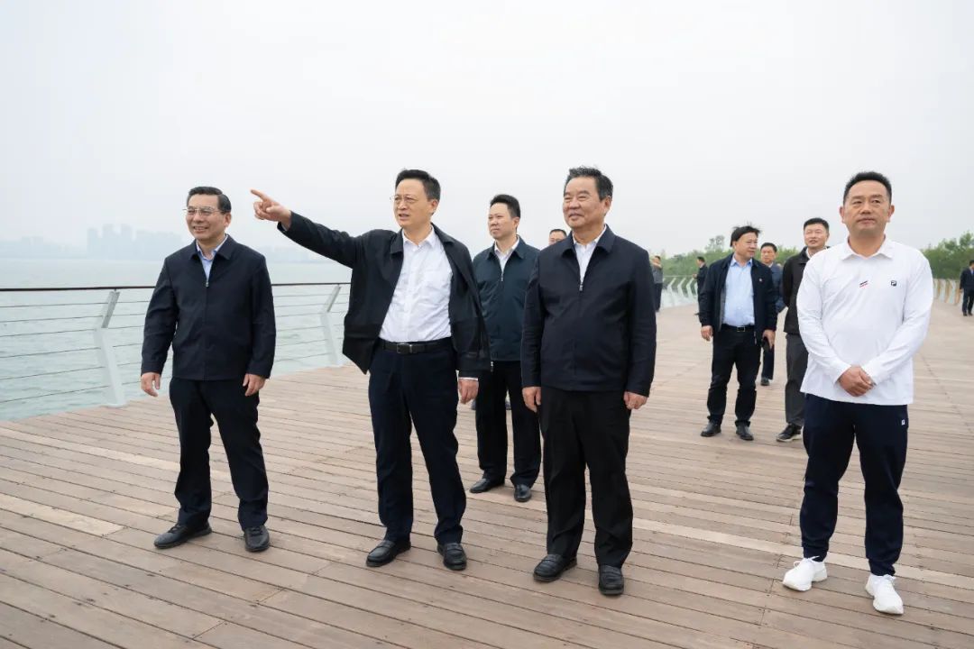 10月13日,何報翔一行在湖北襄陽魚梁洲中央生態公園考察水生態修復情況。