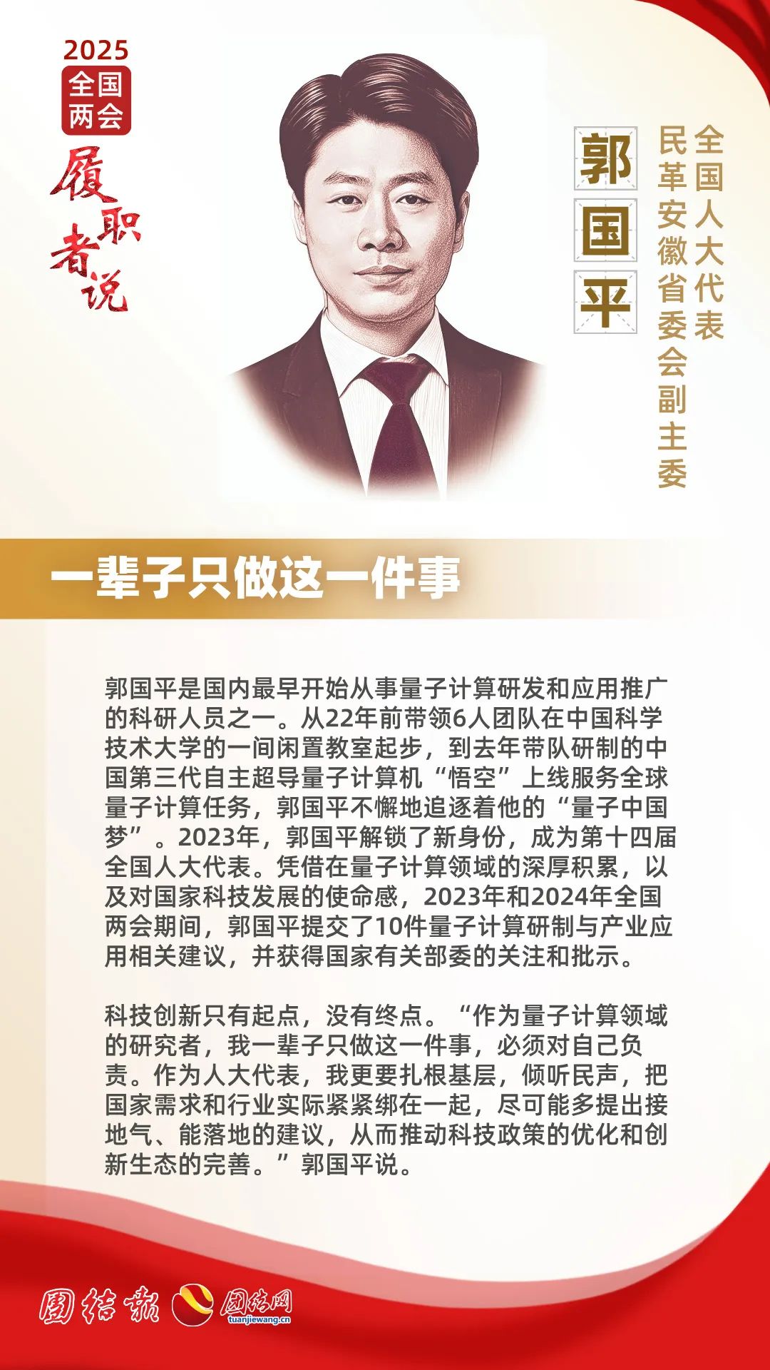 科技創(chuàng)新只有起點(diǎn),沒有終點(diǎn)?!白鳛榱孔佑?jì)算領(lǐng)域的研究者,我一輩子只做這一件事,必須對自己負(fù)責(zé)。作為人大代表,我更要扎根基層,傾聽民聲,把國家需求和行業(yè)實(shí)際緊緊綁在一起,盡可能多提出接地氣、能落地的建議,從而推動科技政策的優(yōu)化和創(chuàng)新生態(tài)的完善?!惫鶉秸f。