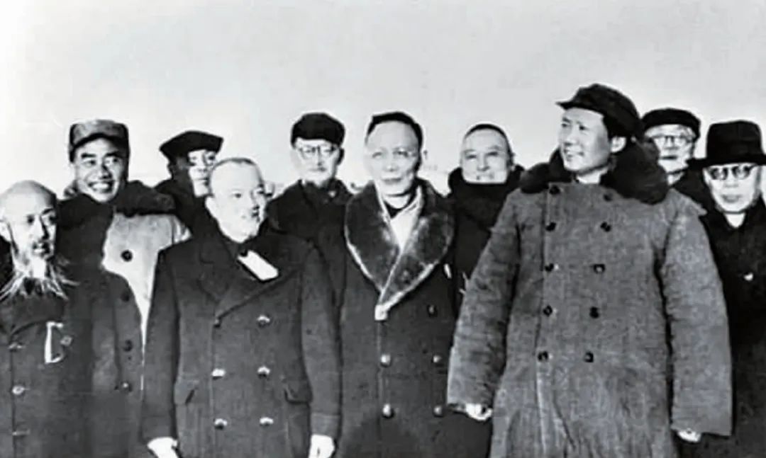 1949年3月25日,毛澤東等率中共中央機(jī)關(guān)和人民解放軍總部進(jìn)入北平,同前來迎接的民主黨派負(fù)責(zé)人和其他民主人士在西苑機(jī)場(chǎng)合影。左四為李濟(jì)深。