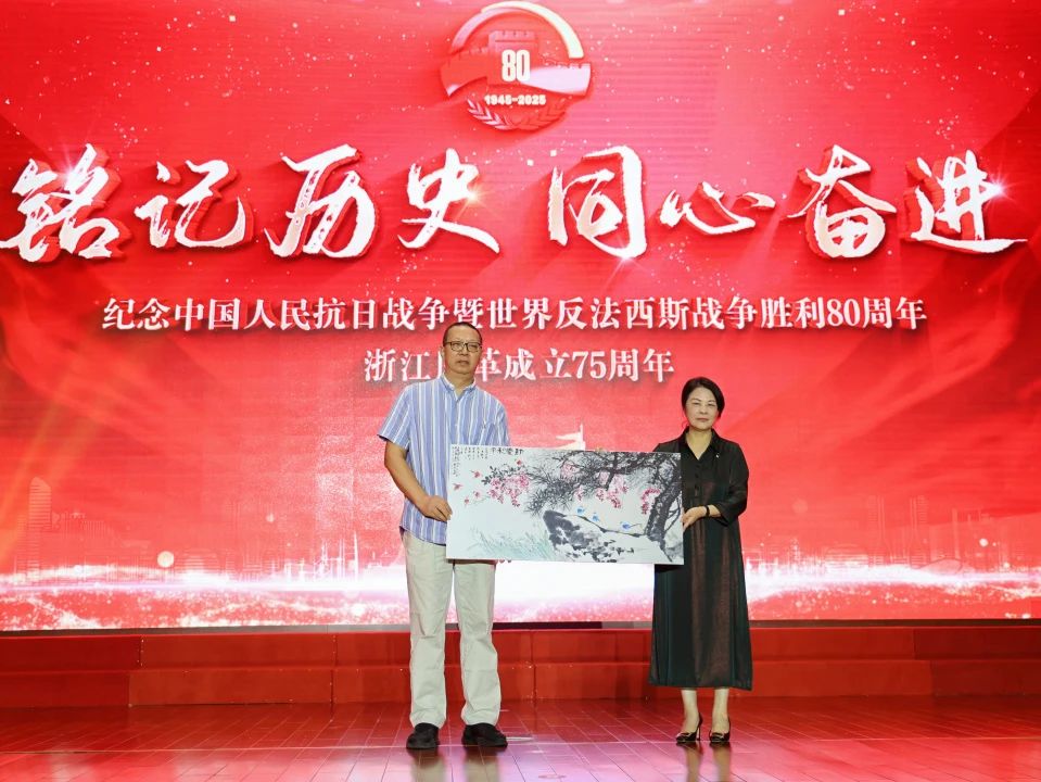 浙江省逸仙書畫院副院長張愛國表示,這次展覽不僅僅是一次藝術的展示,更是對歷史的致敬、對和平的珍視、對未來的期盼。書畫院的老師們滿懷熱情,用心創作,希望用手中的筆、心中的情,去再現那段難忘的歲月,展現多黨合作事業的壯闊歷程,以此啟迪來人,勿忘歷史,珍愛和平,共創未來。他代表浙江省逸仙書畫院向民革浙江省委會贈送書畫作品《珍愛和平》。