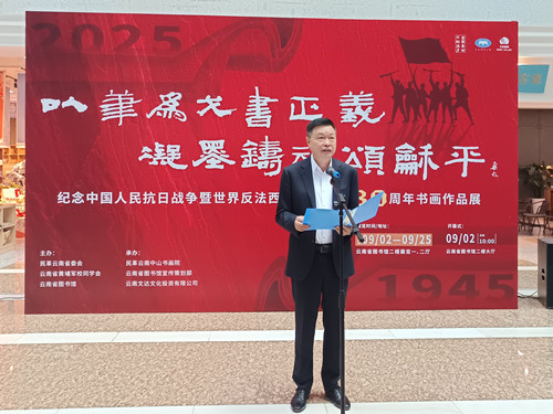 于干千在致辭中指出,云南是中國抗日戰爭的重要戰略基地與國際通道,云南各族兒女同仇敵愾、共赴國難,用鮮血與生命譜寫英雄贊歌。滇軍六十軍臺兒莊死守盡顯匹夫之責,民眾筑滇緬公路保“血線”暢通,子弟兵滇西浴血收復失地。云南抗戰精神彰顯愛國情懷與民族氣節,是中華民族抗戰精神縮影。舉辦這場書畫展,是為了傳承和弘揚民革的光榮傳統,激勵廣大民革黨員銘記歷史、珍愛和平,進一步增強與中國共產黨團結合作的政治責任感和歷史使命感,為實現中華民族偉大復興的中國夢貢獻民革力量。