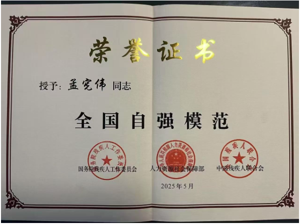 近日,第七次全國自強模范暨助殘先進表彰大會在北京召開。表彰大會上,海南國準鋼結構工程有限公司董事長、民革海南省直屬第五總支黨員孟憲偉榮獲“全國自強模范”稱號。