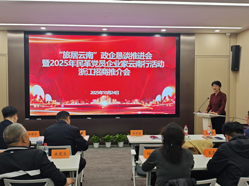 10月24日,民革中央聯絡部部長(主持社會服務部工作)張慶盈、民革云南省委會主委于干千共同率隊赴杭州召開“旅居云南”政企懇談推進會暨2025年民革黨員企業家云南行活動浙江招商推介會。民革浙江省委會副主委徐銘恩出席會議并致辭,民革云南省委會專職副主委王智勇主持會議。