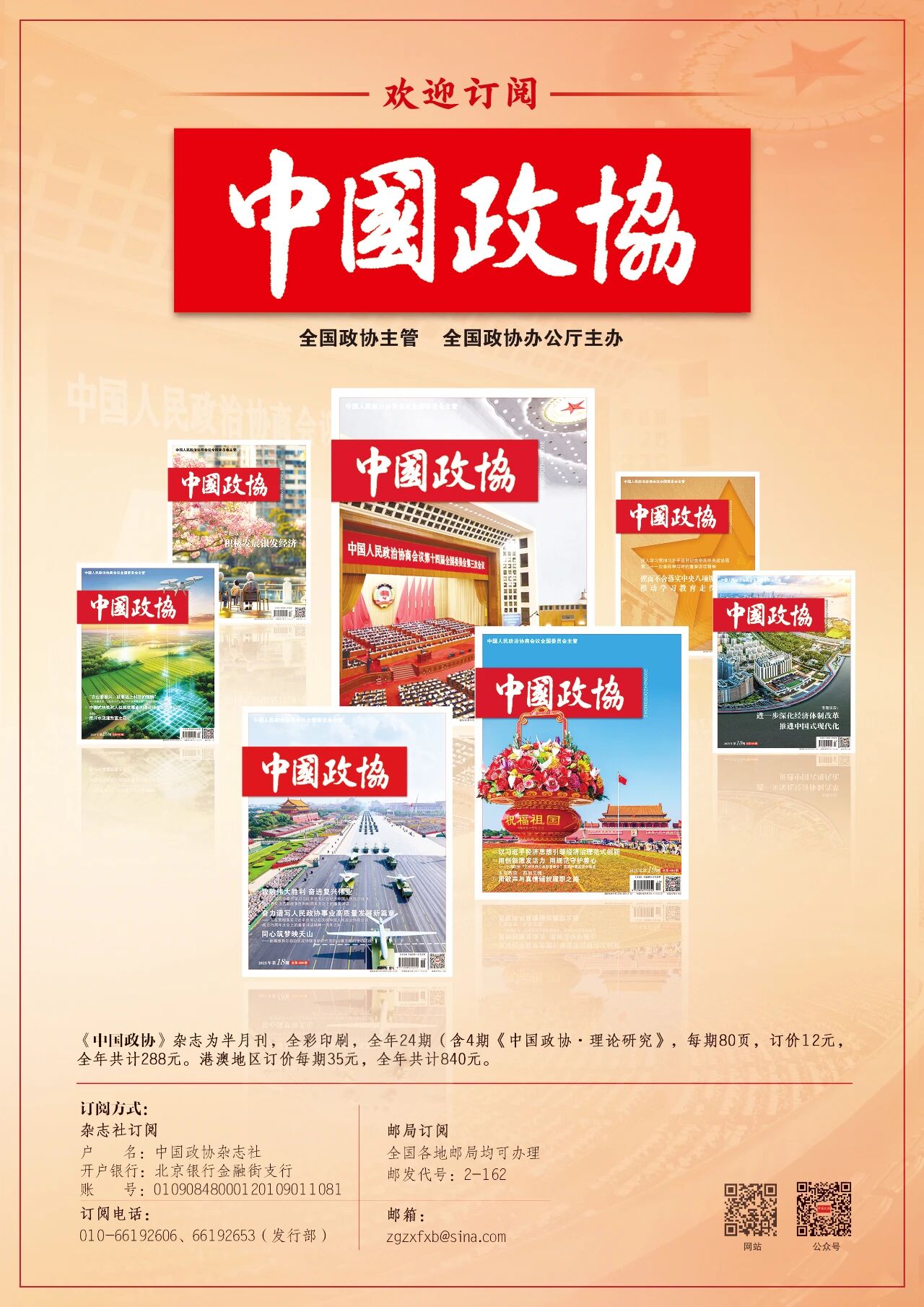 《中國(guó)政協(xié)》雜志為半月刊,全彩印刷,全年24期(含4期《中國(guó)政協(xié)·理論研究》),訂價(jià)每期12元,全年共計(jì)288元。港澳地區(qū)訂價(jià)每期35元,全年共計(jì)840元。